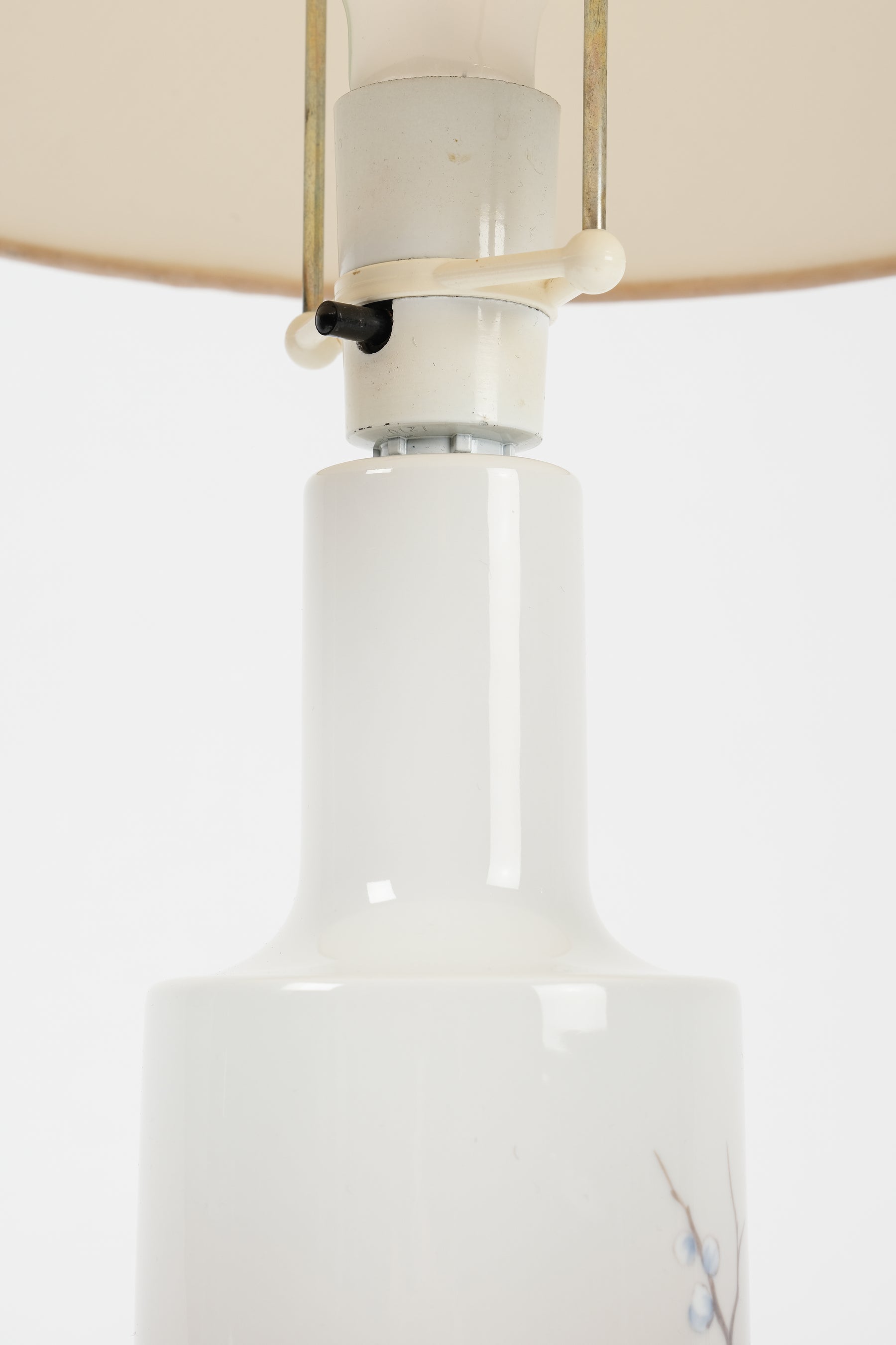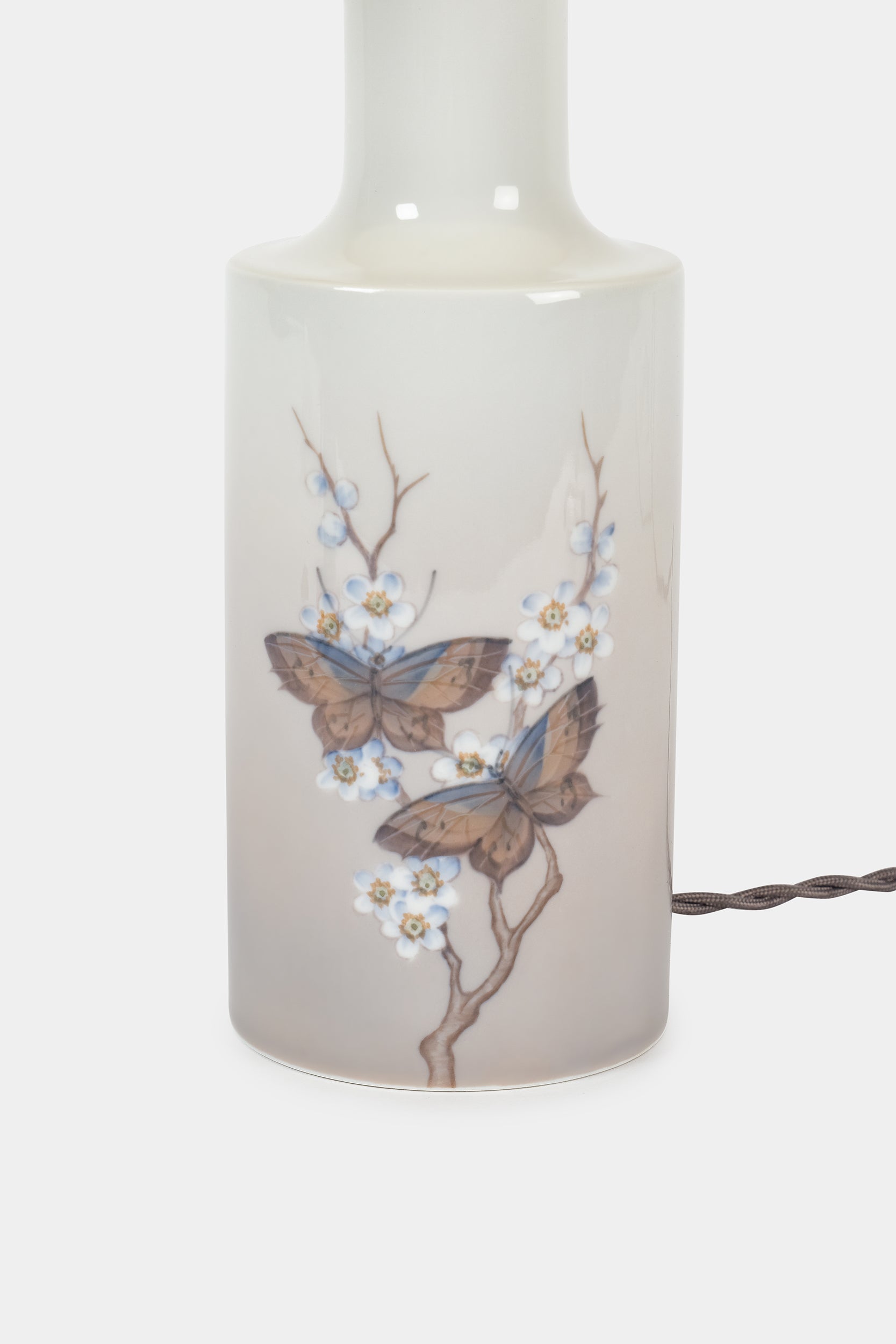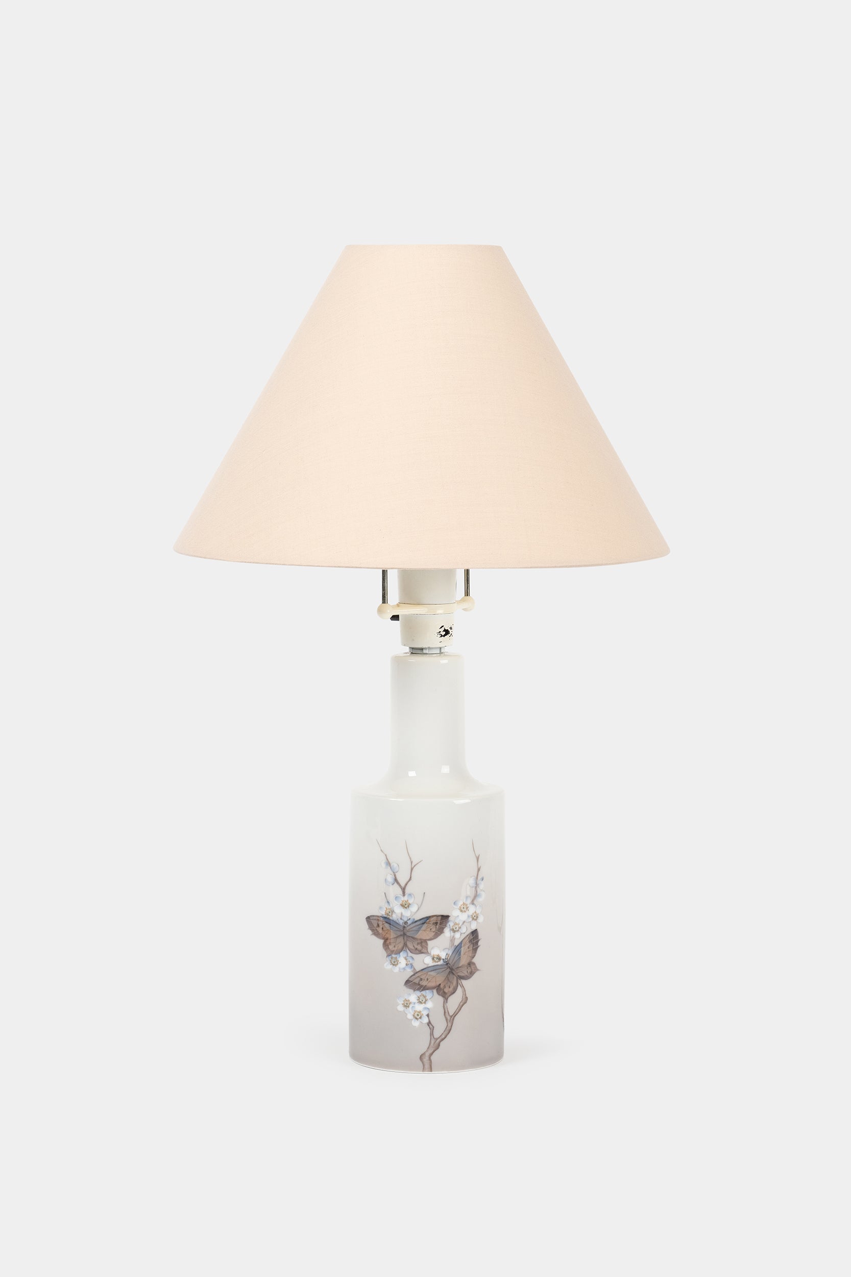 Seltene Tischlampe, entworfen 1969 von Kaj Lange für Royal Copenhagen in Zusammenarbeit mit Fog & Mørup. Die zylindrische Porzellanbasis zeigt zwei feine, handgemalte Schmetterlinge auf blühenden Zweigen. Signiert auf der Unterseite mit dem Royal Copenhagen Logo und Modellnummer 214/4622. In sehr gutem Vintage Zustand mit minimalen Gebrauchsspuren.