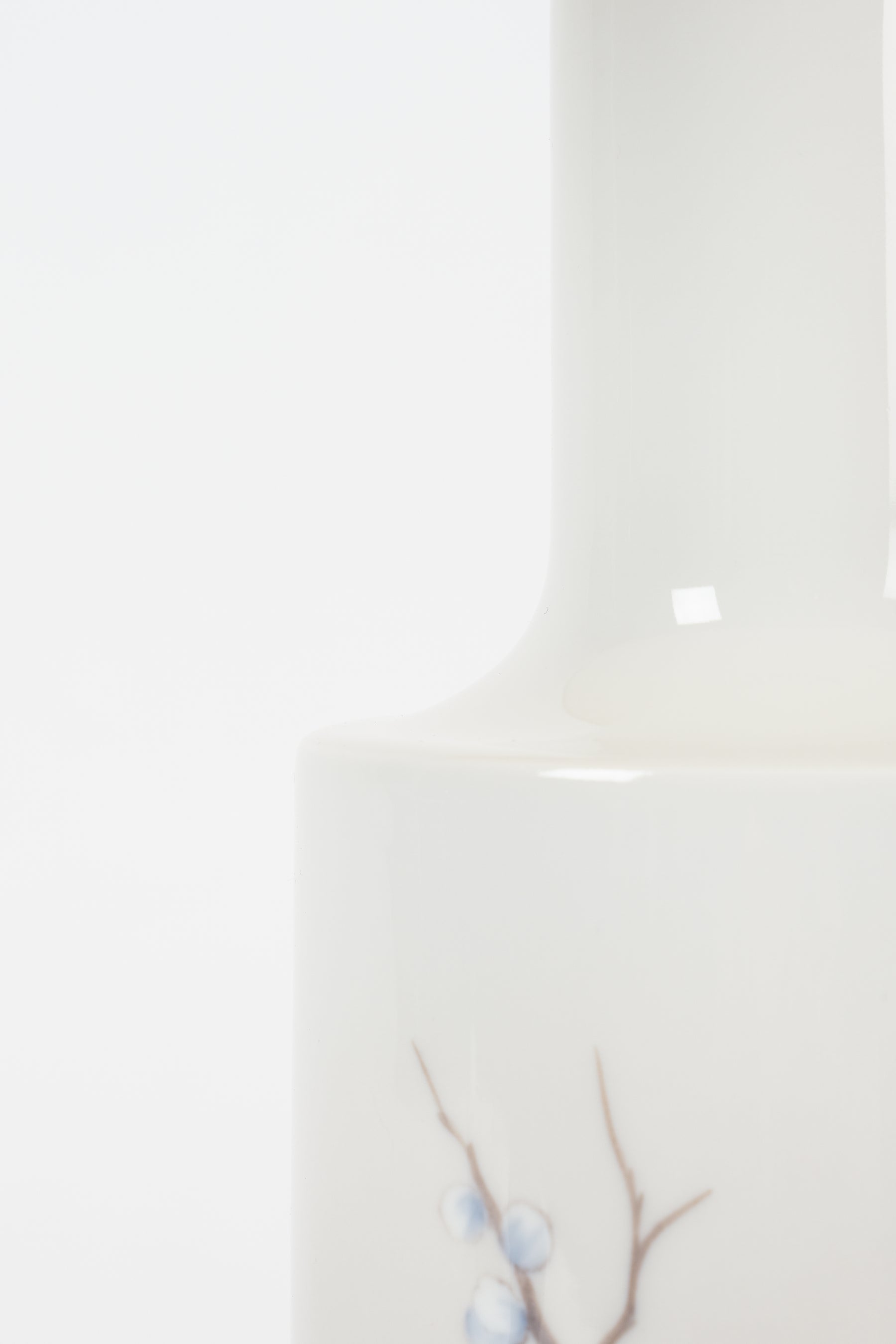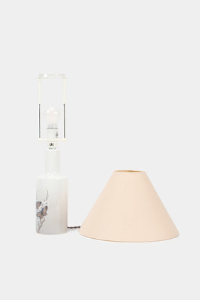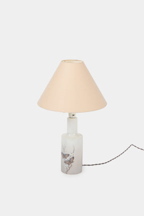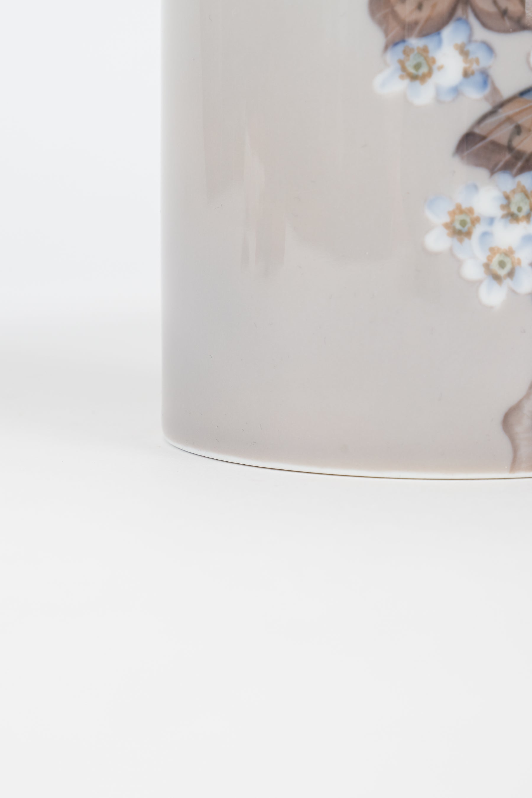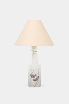 Seltene Tischlampe, entworfen 1969 von Kaj Lange für Royal Copenhagen in Zusammenarbeit mit Fog & Mørup. Die zylindrische Porzellanbasis zeigt zwei feine, handgemalte Schmetterlinge auf blühenden Zweigen. Signiert auf der Unterseite mit dem Royal Copenhagen Logo und Modellnummer 214/4622. In sehr gutem Vintage Zustand mit minimalen Gebrauchsspuren.
